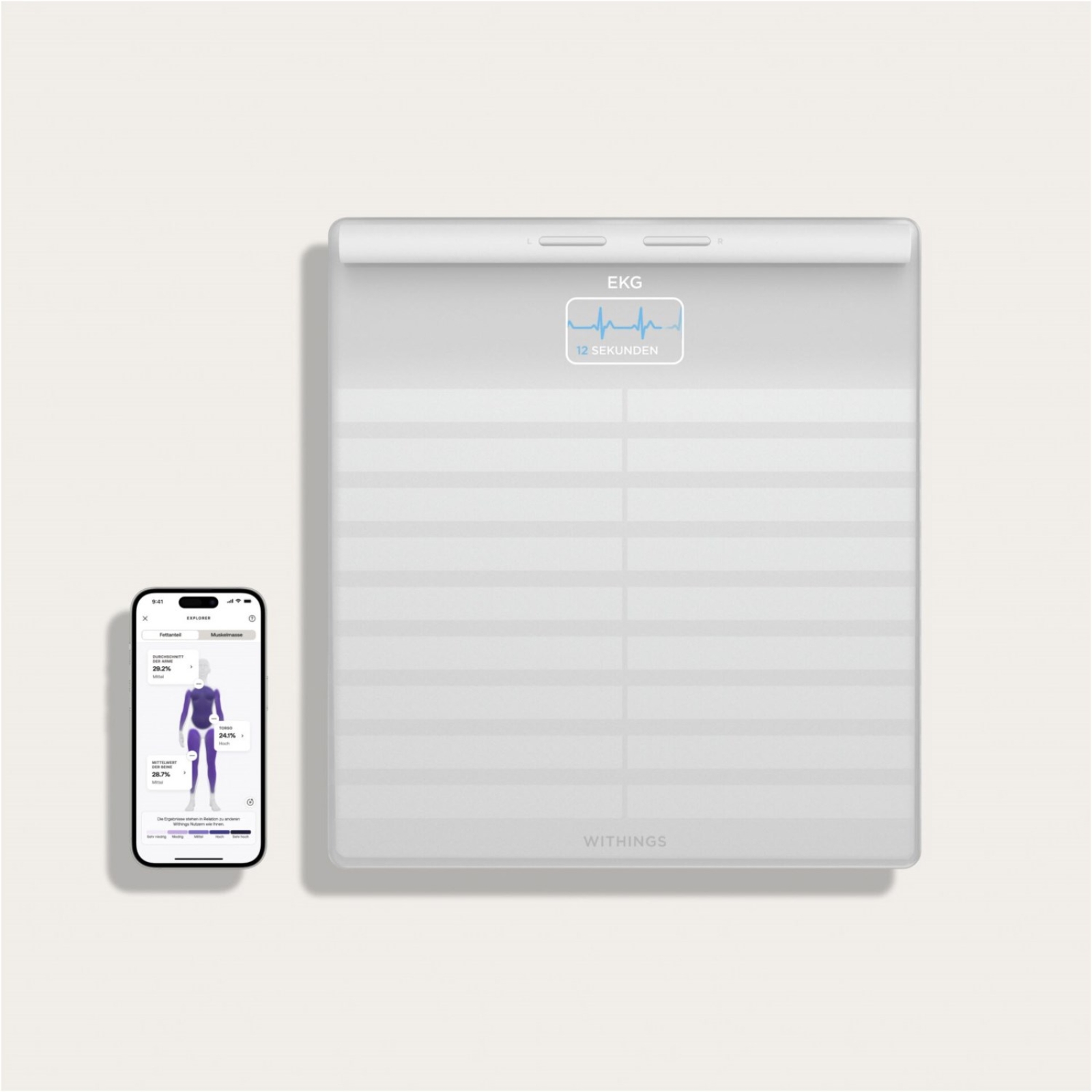 Die innovative Körperwaage Body Scan hilft dabei, die eigene Gesundheit zu überwachen und langfristig zu verbessern. Die vernetzte Gesundheitsstation wurde in Zusammenarbeit mit Kardiologen, Neurologen und Diabetologen entwickelt und bietet eine segmentale Analyse der Körperzusammensetzung, eine Bewertung der Nervenaktivität und eine EKG-Aufzeichnung - alles in einem Wiegevorgang. Die Daten werden nach jedem Wiegen automatisch mit der Withings-App (iOS und Android) synchronisiert, ohne dass das Smartphone in der Nähe der Waage sein muss. Bis zu acht Nutzerinnen und Nutzer können ihre jeweiligen Daten dokumentieren. Die Körperwaage besteht aus robustem und langlebigem Hartglas und besitzt einen hochauflösenden 3,2-Zoll-LCD-Farbbildschirm für gute Lesbarkeit sowie einen ausziehbaren Griff aus widerstandsfähigem Thermoplast. Außerdem verfügt die Waage über einen wiederaufladbaren Akku (USB-C-Kabel im Lieferumfang enthalten) mit einer Gesamtlaufzeit von bis zu 12 Monaten.