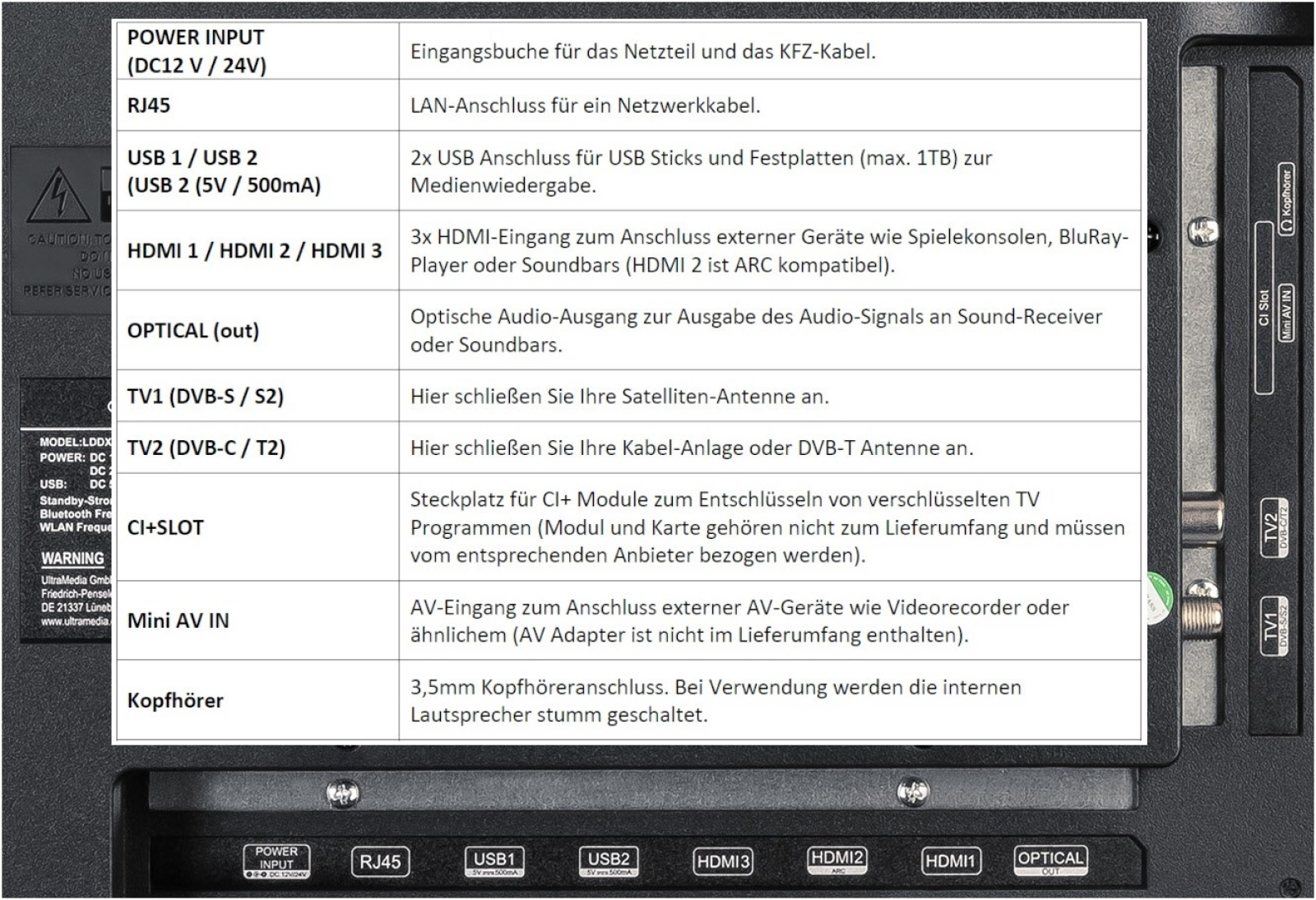 - 3x HDMI, 2x USB, CI+Steckplatz, Mini-A/V-Eingang, Digitaler Audio-Ausgang (optisch), LAN, WLAN & Bluetooth integriert